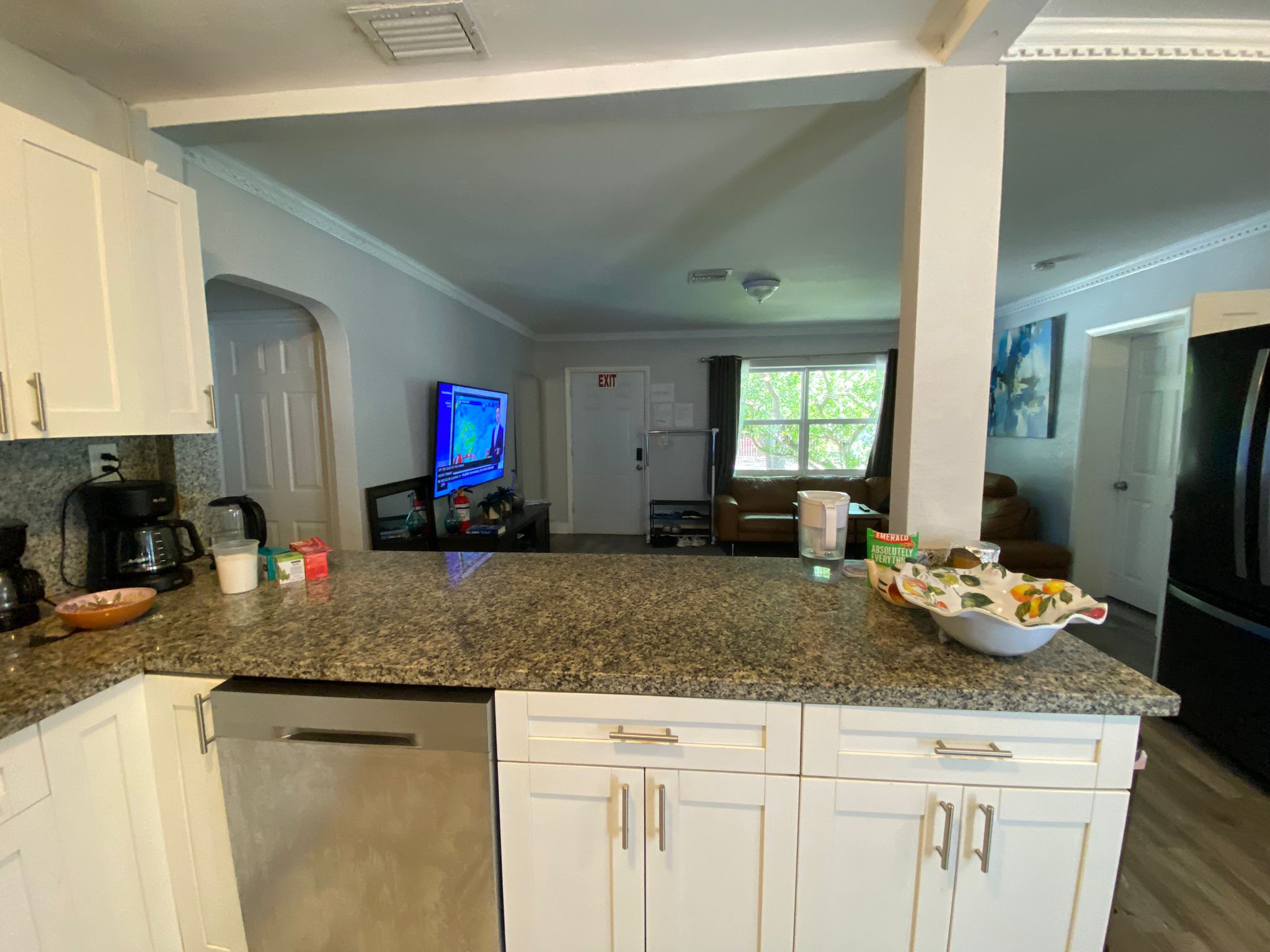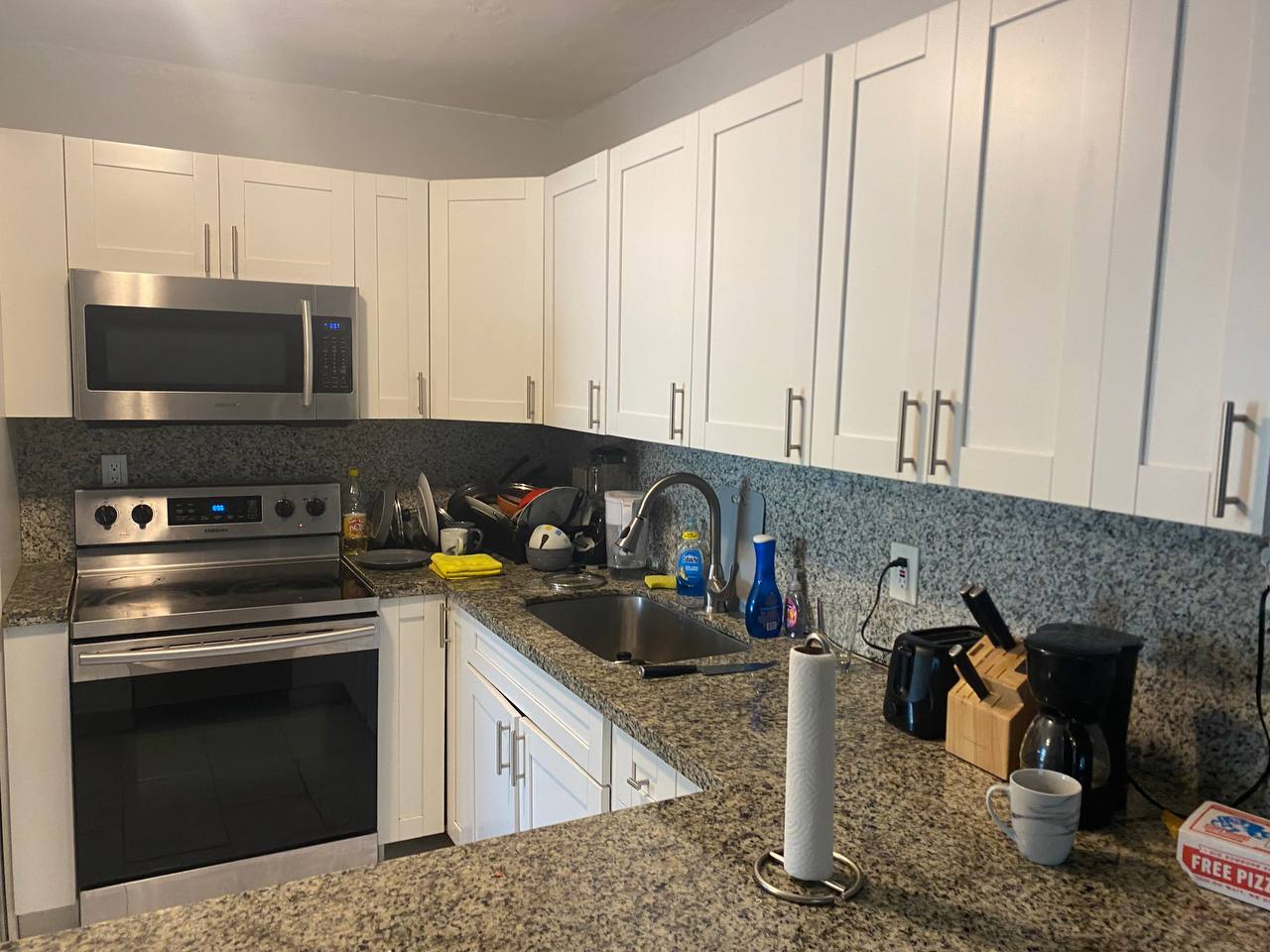 Brand-new coffee machine, always-stocked coffee & tea station.